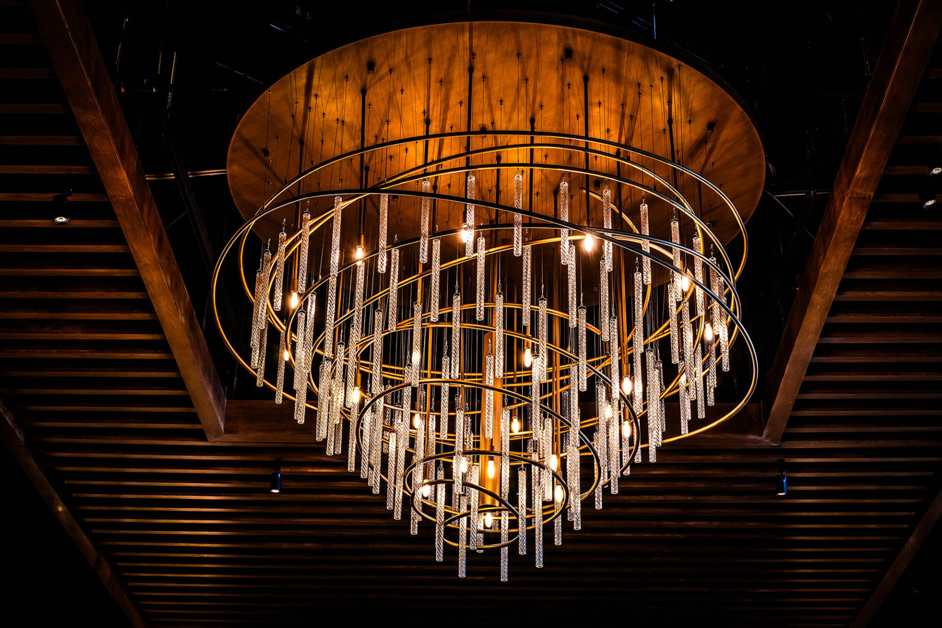 A modern centerpiece with old-world soul, this custom chandelier balances drama and restraint, elevating the guest experience through immersive restaurant lighting design.