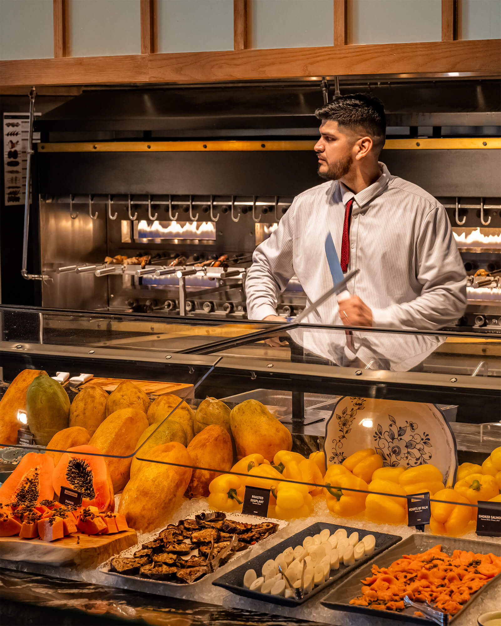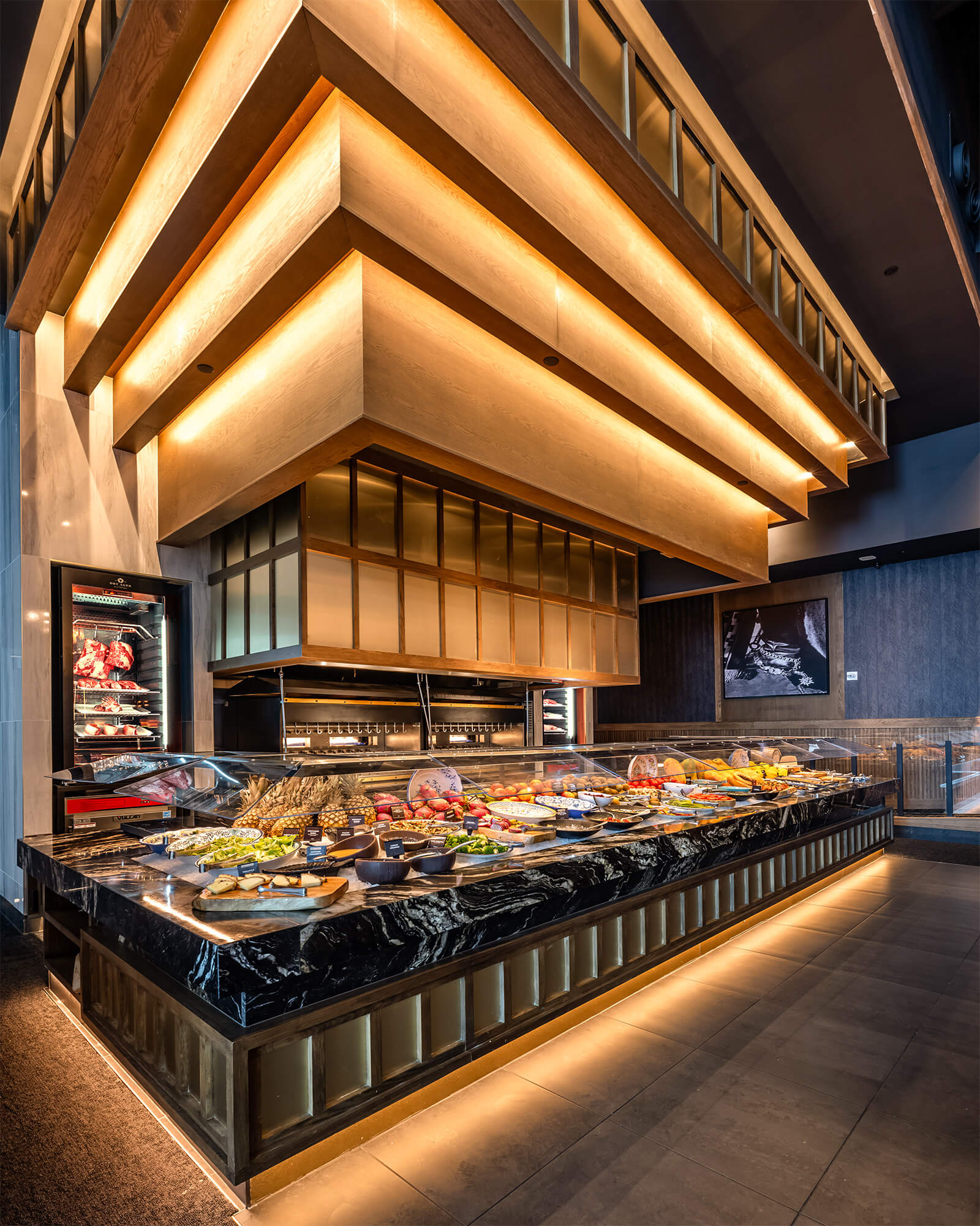 At the heart of the design is Fogo’s iconic Market Table, spotlighted as a visual anchor to reinforce the brand’s experiential dining roots. Above, sculptural lighting draws the eye upward, while sweeping views of the surrounding WTC campus connect guests to the city’s rhythm below.