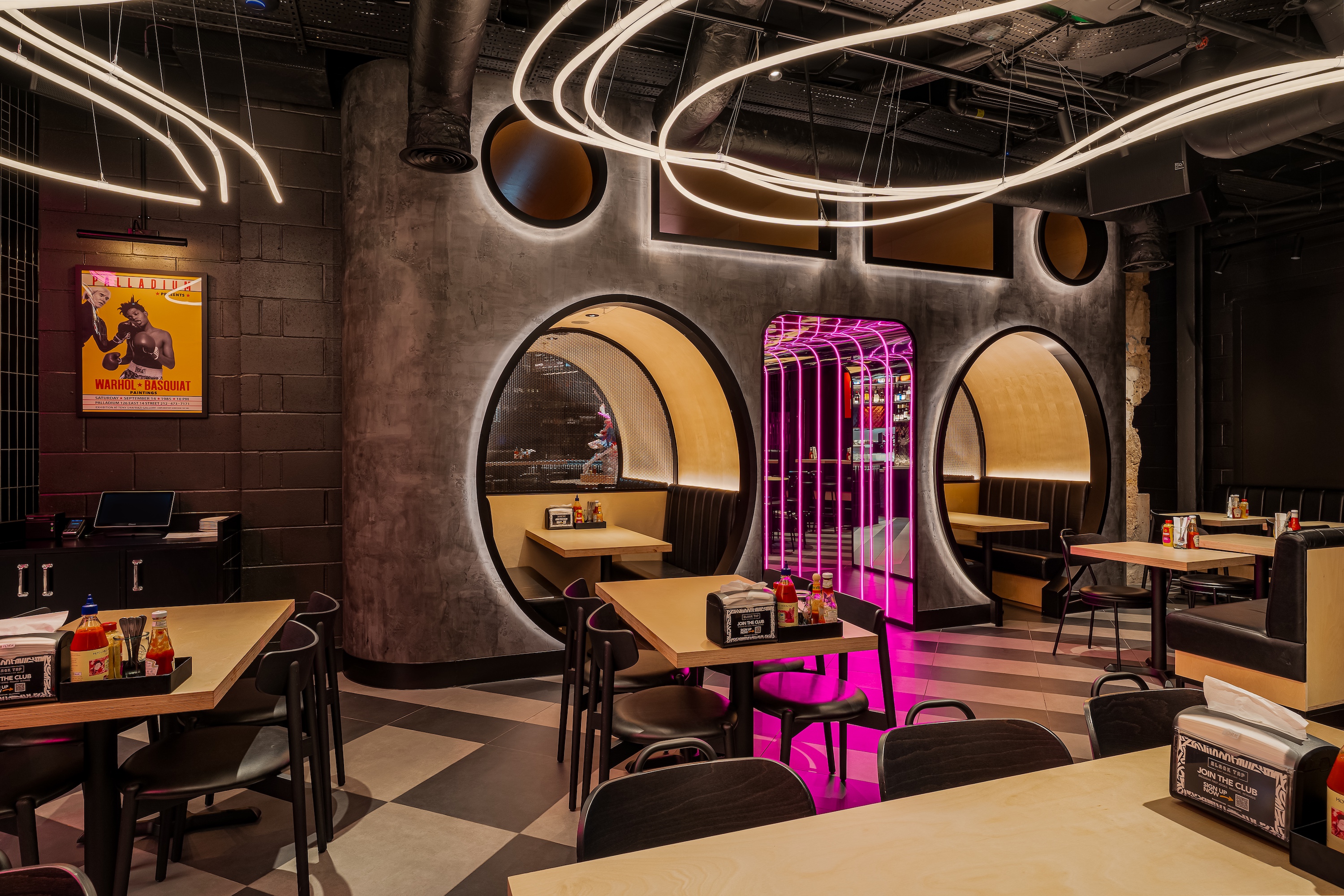 High-traffic environments illustrate this interplay clearly. In airport restaurants, for instance, hundreds of people may enter simultaneously, carrying luggage and moving under time pressure. The placement of seating, counters, queues, and information displays must respond to these conditions. This is a spatial problem that blends operational thinking with architectural understanding. Similarly, in fast-service contexts, the sequencing of ordering, preparation, and service must be orchestrated within the constraints of the space itself. In each case, the design of the interior is inseparable from the architectural structure; one supports and informs the other.